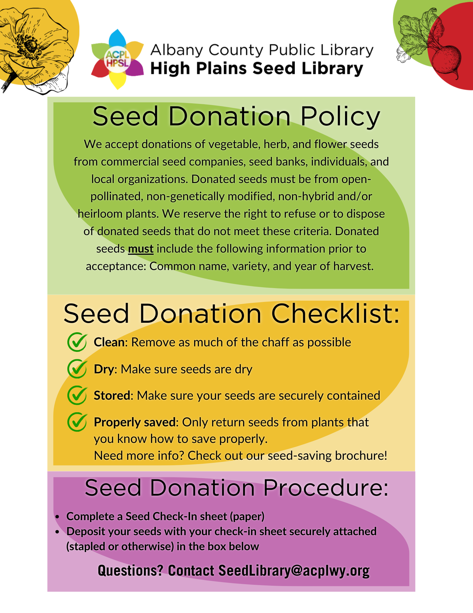 Questions about the seed library or want to be included in the Gardener Contact List? Let us know at SeedLibrary@acplwy.org.
