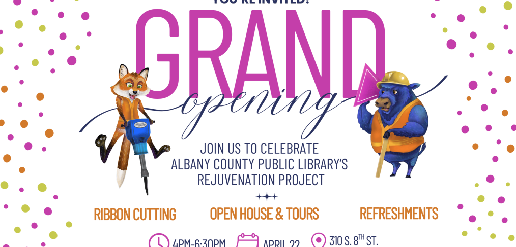 You’re invited! Join us for the grand opening of the new community spaces at ACPL! We’re celebrating the end of construction and official opening of the Community Room, Conference Room, and Activity Center. Joins us for an open house to include a ribbon cutting at 4:30 p.m., tours of the new spaces, and refreshments. Event […]